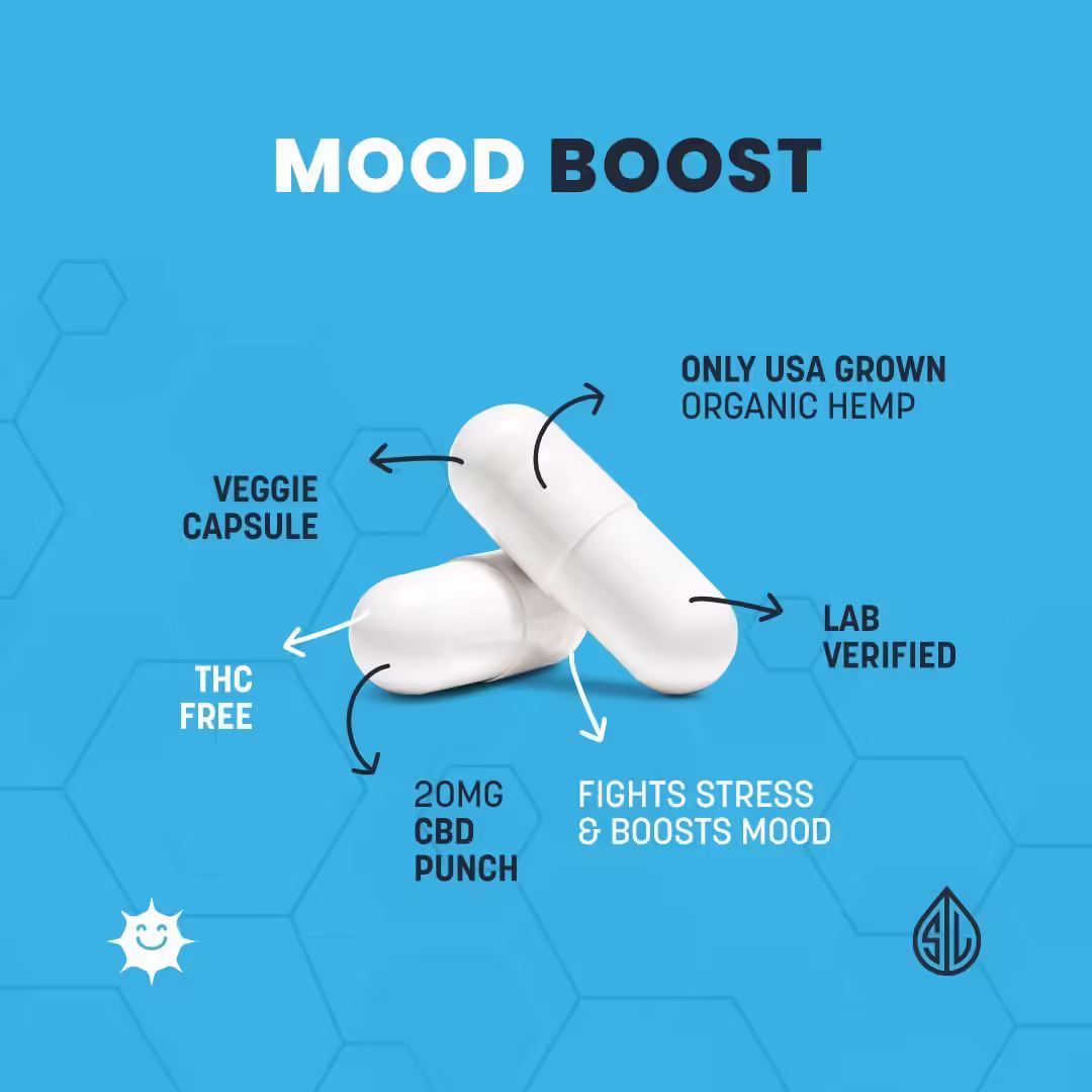 Navigate life’s daily pressures with Simple Leaf CBD’s Mood Boost Capsules—one of our most popular stress-relief solutions. This innovative mood-supporting supplement combines 20mg of premium organic CBD with a carefully curated blend of adaptogens, nootropics, and botanicals designed to help you stay calm, motivated, and positive throughout your day.