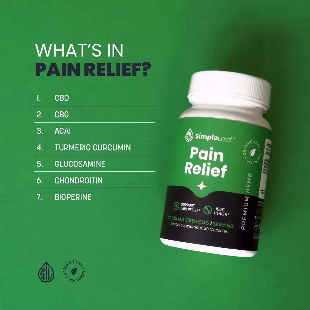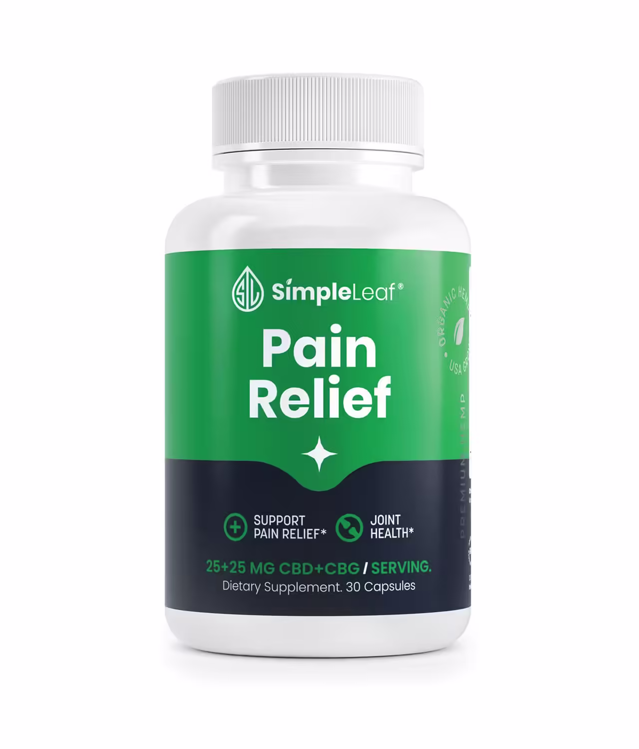 Simple Leaf CBD’s plant-powered capsules combine premium organic CBD and CBG with Turmeric Curcumin, Bioperine, Glucosamine, Chondroitin, and Acai berries to deliver natural relief from everyday pain and discomfort. One of our most popular wellness supplements, this formula targets pain from multiple angles without the side effects of traditional medications.